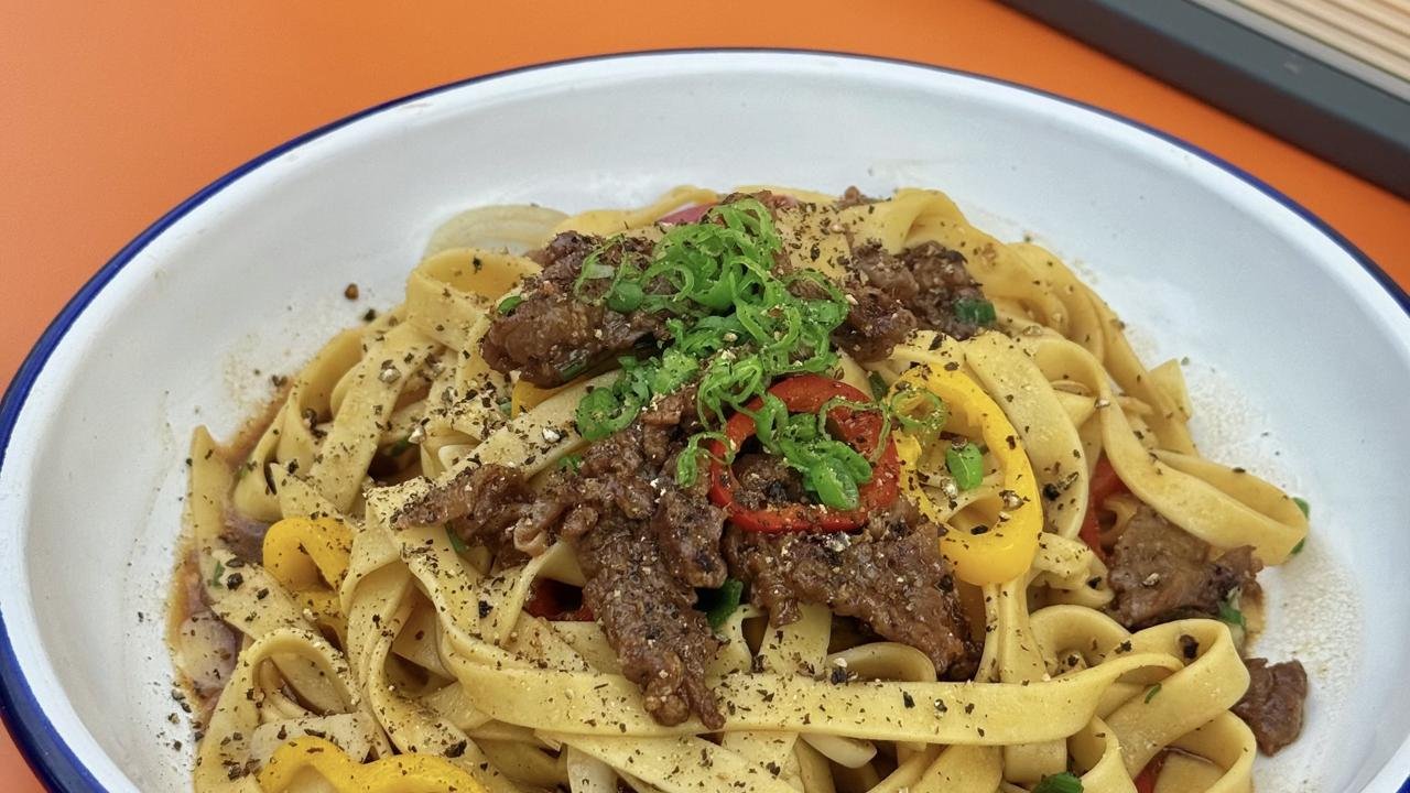 Sweet pepper, beef, soy sauce, oyster sauce.